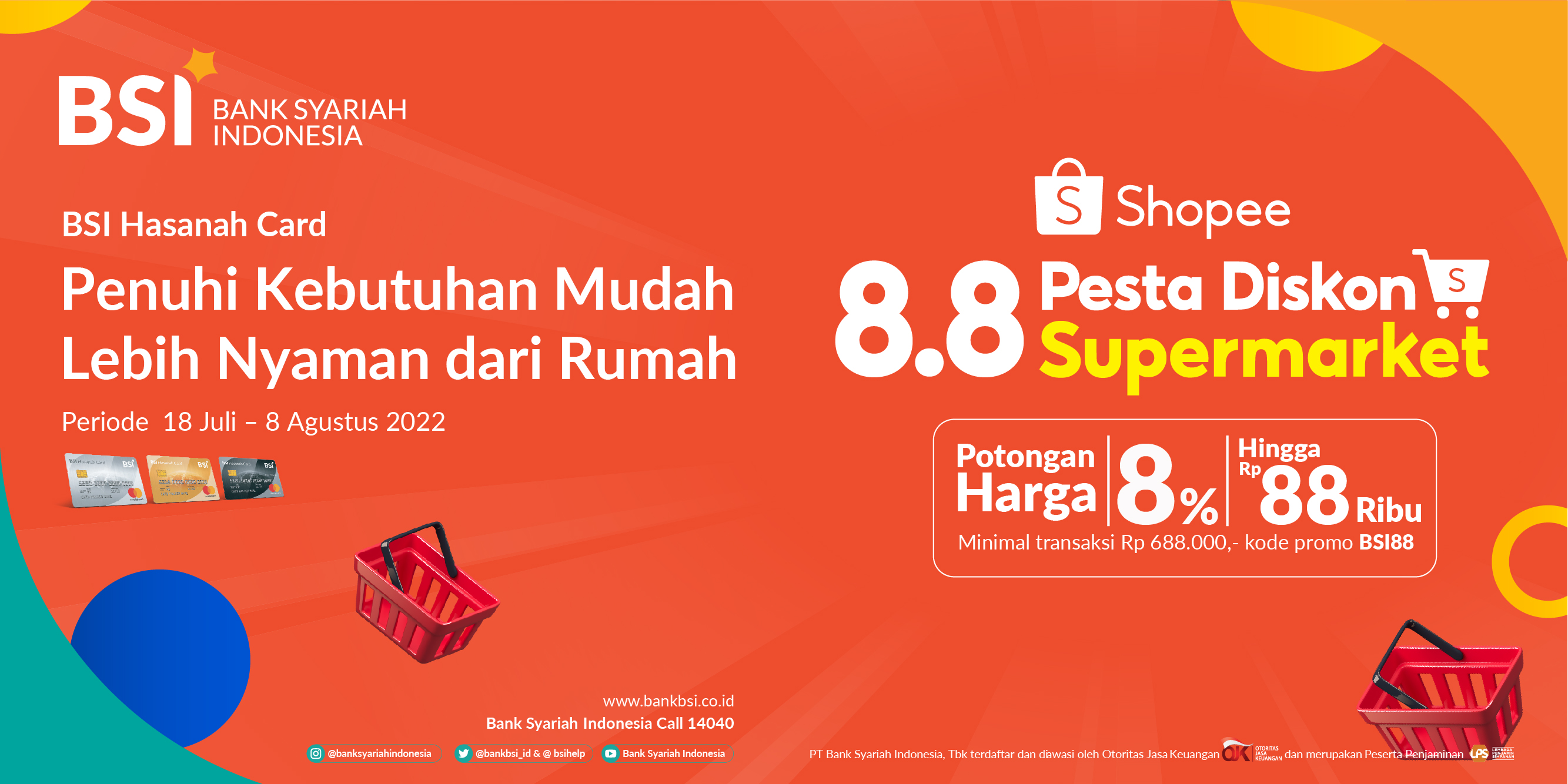 Penuhi kebutuhan harian tanpa keluar rumah di Pesta Diskon Supermarket Shopee 8.8! Dapatkan diskon 8% hingga Rp 88.000,- minimal transaksi Rp 688.000,- menggunakan BSI Hasanah Card.