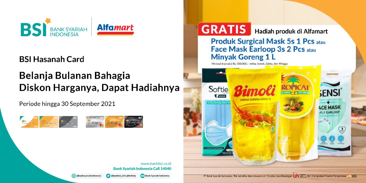 Penuhi kebutuhan harian gratis produk pilihan di Alfamart. Dapatkan Gratis produk Softies Surgical Mask 5S 1 pcs / Sensi Mask Earloop 3S 2 pcs / Minyak Goreng 1L (pilih salah satu) minimal transaksi Rp 300.000,- dengan BSI Debit VISA & BSI Hasanah Card.