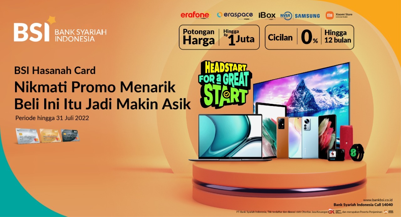 Upgrade gadget terbaru bersama Erafone, iBox, NASA Samsung, Mi Store dan Eraspace. Dapatkan diskon hingga Rp 1.000.000 dan cicilan 0% hingga 12 bulan menggunakan BSI Hasanah Card.