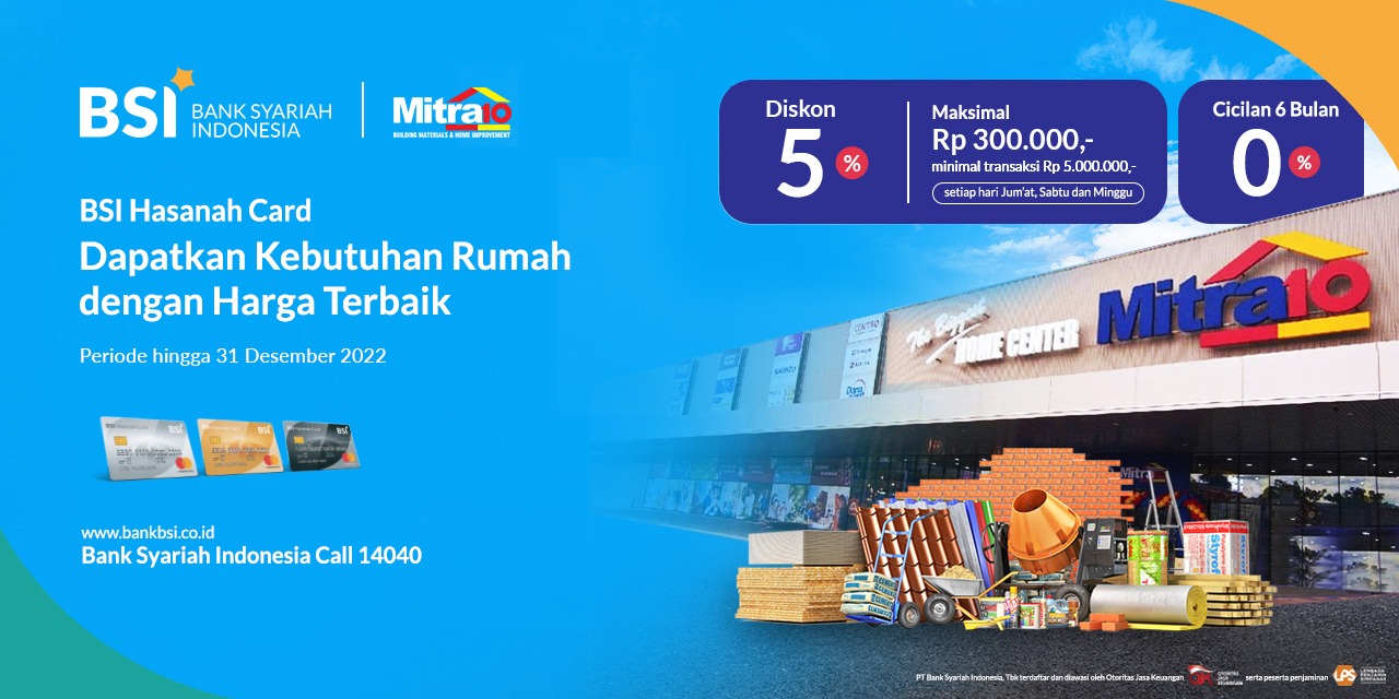 Bangun atau renovasi hunian impian di akhir pekan bersama Mitra10. Dapatkan diskon 5% hingga Rp 300.000 & Cicilan 0% 6 bulan setiap hari Jum'at, Sabtu dan Minggu menggunakan BSI Hasanah Card.