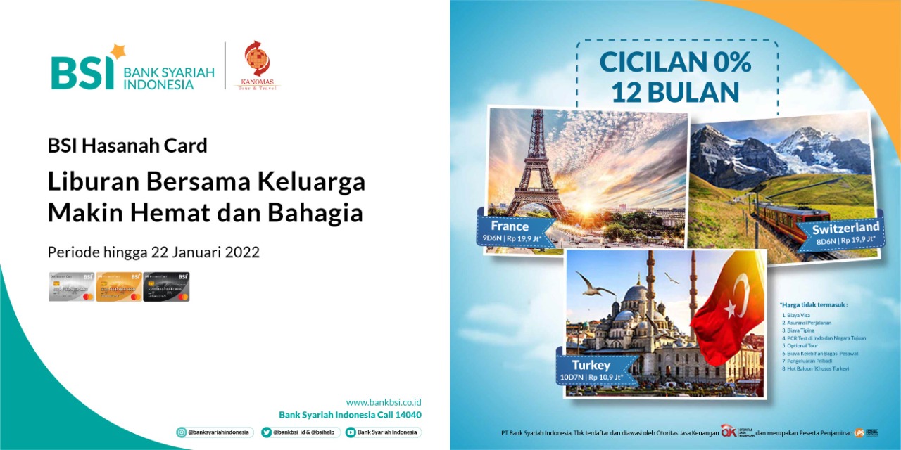Pesan sekarang untuk rencana liburan lebih ringan di Kanomas Arci Wisata. Dapatkan Cicilan 0% hingga 12 bulan untuk pembelian paket wisata Turkey, France & Switzerland dengan BSI Hasanah Card.