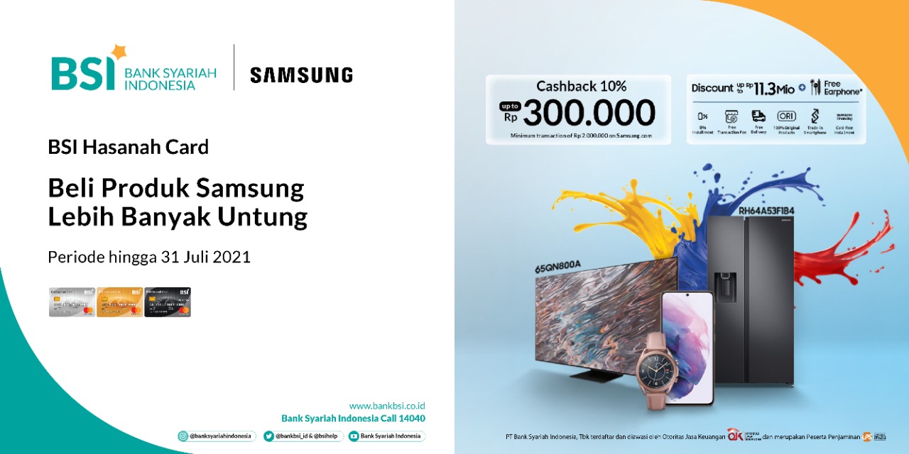 Miliki produk Samsung dengan penawaran eksklusif di Promo Spesial Samsung. Dapatkan diskon hingga Rp 11.300.000,-, free gimmick menarik, tambahan cashback hingga Rp 300.000,- dan cicilan 0% 6 bulan untuk pembelian produk Samsung dengan menggunakan BSI Hasanah Card.