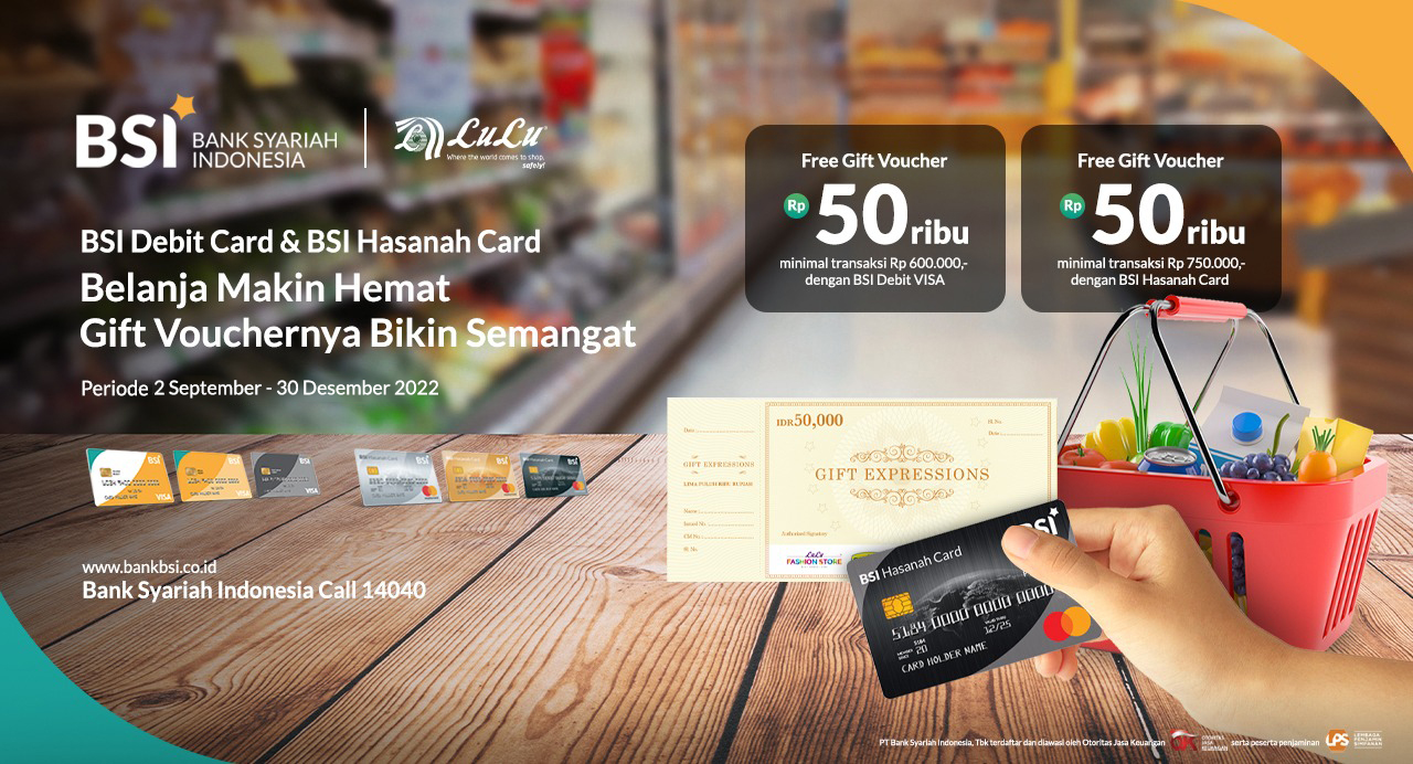 Belanja cermat dan hemat di LuLu Hypermarket. Dapatkan free gift voucher Rp 50.000,- dengan BSI Debit VISA dan BSI Hasanah Card.